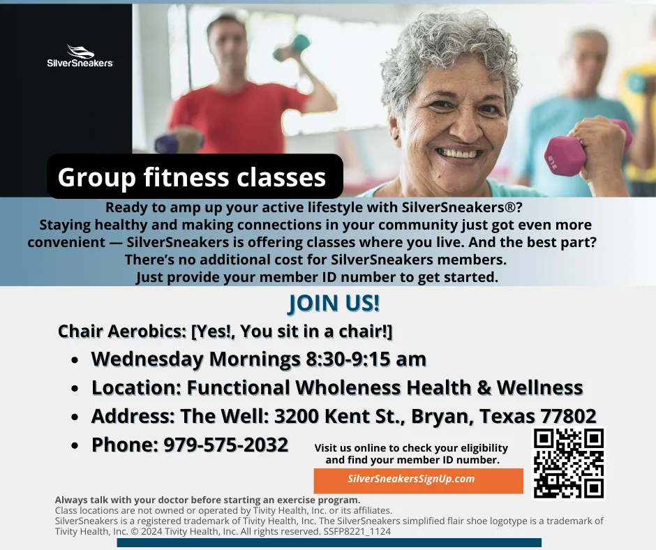 Join the In-Person Community Chair-Based Exercise, local to the BCS-TX area. We meet every Wednesday morning to move our body with Chair-Aerobics. (Yes, you sit in a chair!)